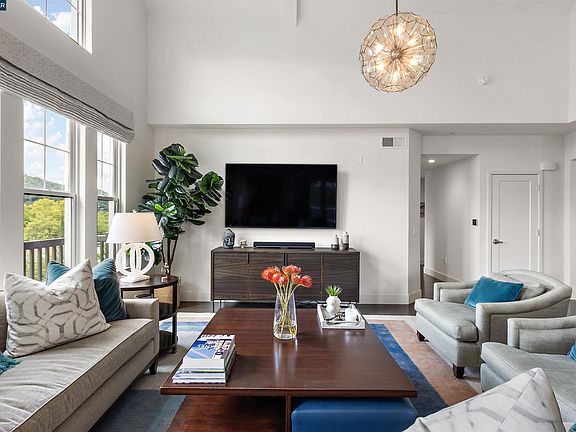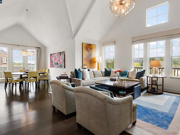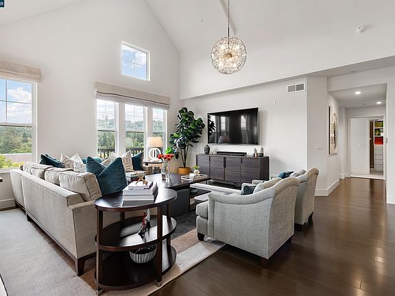 Sophisticated Penthouse with Panoramic Views and Designer Elegance. Perched serenely on the top floor, this stunning penthouse offers sweeping vistas of Mt. Diablo and the Lafayette hills. Soaring cathedral ceilings and abundant natural light create an airy, expansive ambiance, while designer lighting—anchored by a showstopping Ochre chandelier—adds a touch of refined elegance to the open-concept layout. Step onto your private balcony to enjoy a tranquil retreat above it all—perfect for morning coffee or evening sunsets. The chef’s kitchen features quartz countertops, a striking glass tile backsplash, stainless steel appliances, an oversized built-in refrigerator, a 5-burner gas range, and generous counter seating—ideal for both everyday living and effortless entertaining. The primary suite is a serene sanctuary, complete with dual vanities, a custom walk-in closet, and a spa-inspired bathroom. Ideally located just steps from acclaimed restaurants, charming boutiques, cozy cafés, BART, and everyday essentials, this impeccably appointed residence offers an unmatched combination of luxury, comfort, and convenience. Additional highlights include: • Rich hardwood floors • In-unit laundry • Central heat and a/c • Two parking spaces • Bike storage • Secure building