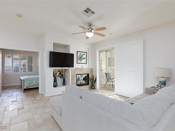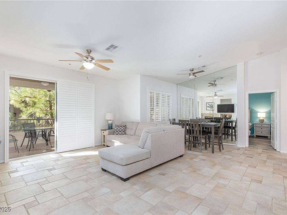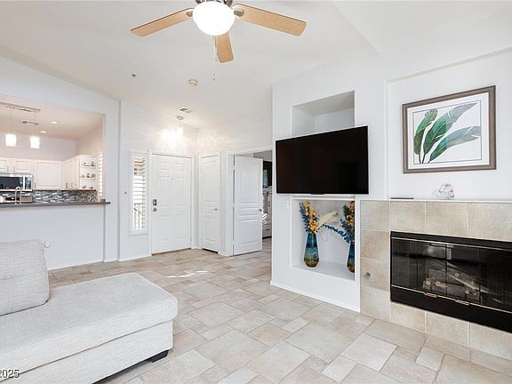 Enjoy style, comfort, and convenience in this beautifully updated 2-bedroom, 1.5-bath Summerlin condo, located right along TPC Las Vegas. This home features plank ceramic tile and LVP flooring throughout (no carpet), quartz countertops, a designer backsplash, stainless steel appliances, and upgraded lighting fixtures over the breakfast bar and entryway. Plantation shutters add timeless charm, while the primary suite includes a walk-in closet with custom built-ins and a barn door leading to the ensuite bathroom. The covered balcony offers a peaceful outdoor space with plenty of room for seating. Located in the Cierra gated community with a pool, walking paths along the golf course, and close proximity to Tivoli Village, Boca Park, and Summerlin Library. Easy access to Summerlin Parkway and the 215 makes commuting a breeze. Refrigerator, washer, and dryer are all included.