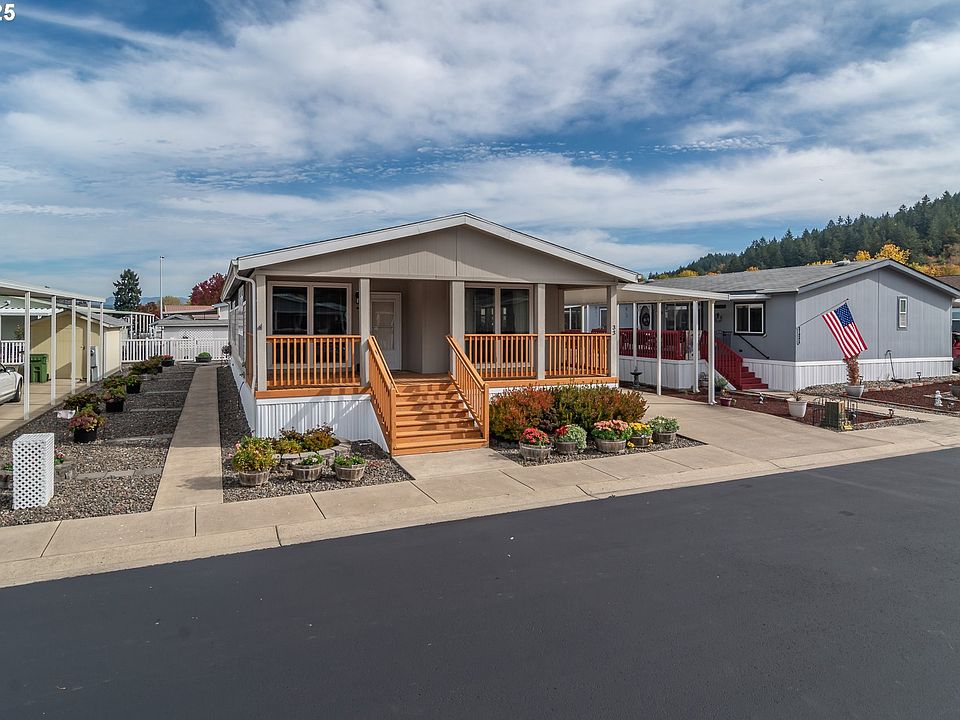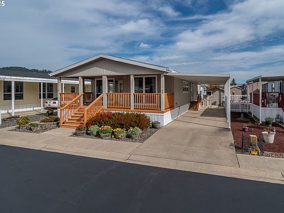 Come enjoy your favorite hot or cold beverage on the spacious front covered porch of this beautiful one of a kind custom 2016 home in Silver Glenn 55+ Park in Sutherlin, Oregon! This home features custom cabinetry with easy pull- outs for convenient access to your kitchen supplies & cookware with an open living area, breakfast island, built-in cell phone storage nook, built-in entertainment center, newer carpet in living room, ample storage space & more. Outside you will find well kept & cared for potted flower garden with built-in drip system, spacious garden shed, chair lift to bring in chair from your vehicle into home, & a nice carport to keep you dry from the winter rain & keep your vehicle under cover! This is a 55+ Park featuring some park amenities such as shared swimming pool access, access to shared party room, & water/sewer/garbage is also included in your space rent! Schedule your showing apt today!