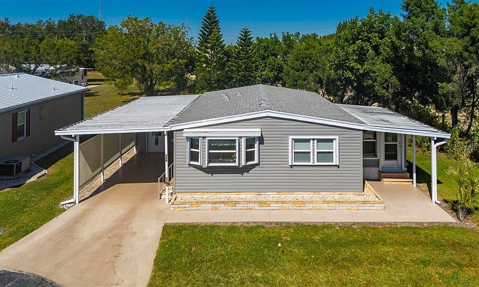 Port Charlotte Village was Voted #1 Manufactured home community in 2024. Not in Flood Zone. Turnkey 2-bedroom, 2-bath manufactured home nestled in a peaceful 55+ community! This charming home is located at the end of a quiet cul-de-sac surrounded by mature trees, offering privacy and a serene setting. Inside, you’ll find a spacious and well-designed layout with generously sized rooms and plenty of closet space throughout. The large living room is bright and inviting, ideal for relaxing or entertaining guests. The home features all new Samsung appliances, new double-pane windows that help keep the home quiet and energy efficient, a roof from 2022, water heater from 2023, and an updated electrical panel. The kitchen is warm and welcoming with a large bay window that fills the space with natural light, ample counter space, and a pantry accented by a beautiful wood-gliding barn door. The enclosed Florida room offers additional living space with A/C and privacy from the surrounding fence and lush trees — perfect for year-round enjoyment. Outside, you’ll find a large storage shed with a washer and dryer, plus a new carport with privacy screening on one side. This move-in-ready home combines comfort, convenience, and style — the perfect place to enjoy the Florida lifestyle in a friendly and active community!