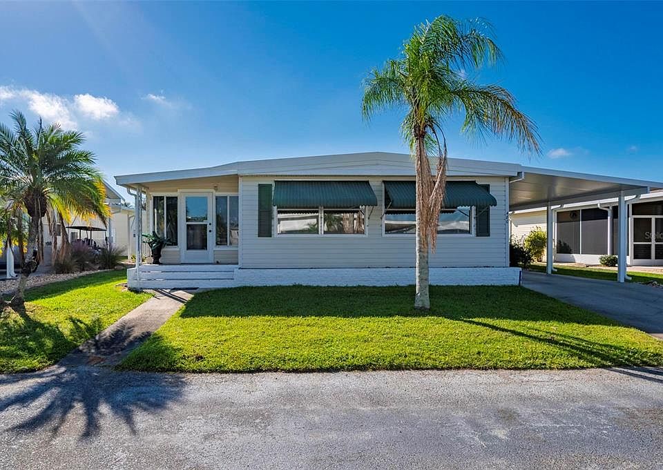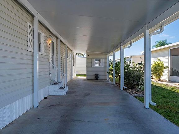 Port Charlotte Village was Voted #1 Manufactured home community in 2024. Not in a Flood Zone . TURNKEY & BEAUTIFULLY UPDATED! This charming 2-bedroom, 2-bath manufactured home is located in a peaceful cul-de-sac within a desirable 55+ community. Featuring a unique and spacious layout, this home offers exceptional storage and inviting living spaces throughout. The large kitchen stands out with its distinctive epoxy countertops, large double sink, abundant cabinets, and generous pantry—perfect for those who love to cook or entertain. The open dining and living areas provide plenty of room for gatherings, while the enclosed Florida room, connected to central air, offers additional year-round living space. Both bedrooms are impressively large with walk-in closets, and you’ll immediately notice the detailed woodwork on the walls and ceilings that adds warmth and character to every room. Additional upgrades include new vinyl flooring, storm shutters, a brand-new extended carport from December 2023 with ample parking, a roof installed in September 2023, a complete HVAC system from August 2018, and a water heater from 2024. This turnkey home is full of thoughtful touches and ready for you to move right in and start enjoying Florida living at its finest!