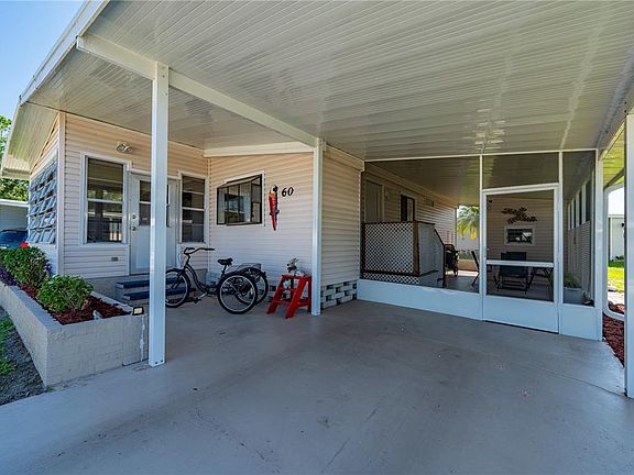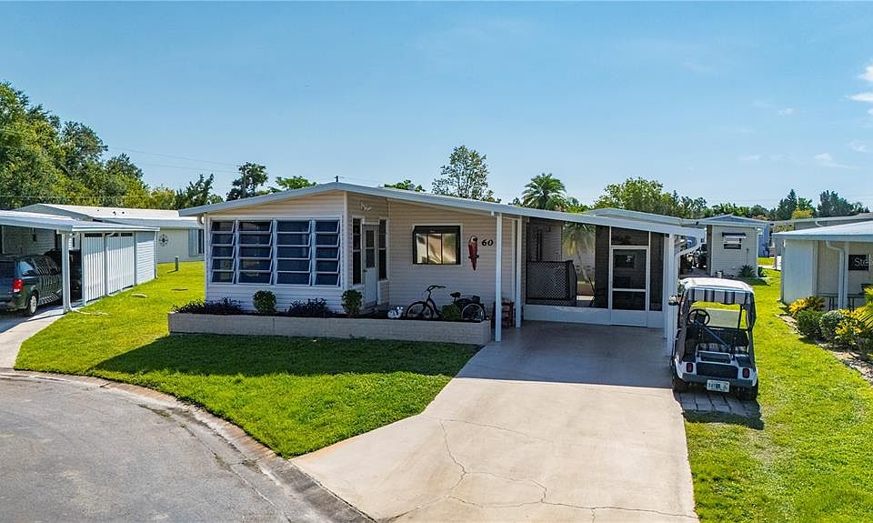 Welcome to this absolutely charming 2-bedroom, 2-bath manufactured home located in a highly desirable 55+ co-op community. From the moment you arrive, you’ll notice how well cared-for and thoughtfully updated this home is. The spacious screened-in lanai, newly replaced in 2023, offers the perfect space for outdoor relaxation or entertaining. Just off the lanai is a large storage shed complete with a washer, dryer, and a small workshop area—ideal for hobbies or extra storage. Inside, this home is full of character and personal touches. The kitchen features a beautiful plant bay window, ample counter space, and plenty of cabinetry for all your needs. The open living and dining areas are bright and spacious, with newer luxury vinyl flooring running throughout the entire home. The bathrooms are well-appointed, with the primary bath offering a relaxing Jacuzzi tub. Both bedrooms include generous closet space, and the enclosed Florida room at the front of the home provides a sunny, comfortable space to enjoy your morning coffee or watch the neighborhood activity. Major updates include a brand-new HVAC system installed in 2024, a new vapor barrier added in 2023, and a durable membrane roof for long-term peace of mind. Furniture and the golf cart are negotiable, making it easy to move right in and start enjoying the Florida lifestyle. This welcoming community is ideally situated close to shopping, top-rated golf courses, restaurants, entertainment, excellent fishing, and the gorgeous blue waters of Florida’s Gulf Coast beaches.
