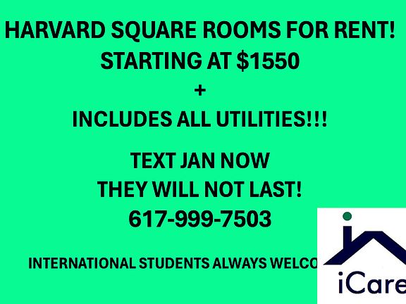Imagine paying ONE flat rate for rent every month ALL costs covered in these rooms! The base rate includes WIFI, ELECTRICITY, HEAT, HOT WATER, AND MORE and now with central air conditioning for your comfort! It's not your responsibility to pay any of these bills; everything is provided! Yes, even your cups, plates, and cookware! Large rooms available in an 8-bed, 3.5-bath apartment right on Memorial Drive, with waterfront views and walk-to-Harvard convenience. Welcome to 1000 Memorial Dr, Unit #2R an expansive 3,400 sq ft apartment built for those who need space, sunlight, and reliable high-speed Wi-Fi. Room prices range from $1500 $1700/month and include all utilities heat, hot water, electricity, gas, Wi-Fi, and central air conditioning with no surprises. All rooms are spacious, furnished, and have ample space for your bed, desk, and dresser. Some rooms accommodate 2 occupants for an additional $400/month. Enjoy in-unit laundry, hardwood floors, fully furnished common areas, and a large kitchen equipped with a dishwasher and generous cabinet space for private food storage. Modern amenities include keyless entry and a responsive landlord committed to making your stay comfortable. Flexible lease terms 12-month preferred, but short-term and sublets are available. Couples may be considered for an additional monthly fee. Sorry, no dogs; cats may be considered. The house is well-maintained and student-friendly, with recent bathroom upgrades and energy-efficient windows throughout. Plenty of street parking nearby. Renters insurance is required. Less than 500 steps to Harvard Square. Yes, we counted. International students and students on visas are very welcome. Legal stuff we must to disclose. Sorry the lawyers made us do it! :) * Unless otherwise stated this listing is an open listing and may be subject to a broker fee. * Prices and availability subject to change without notice. * Square footage definitions vary. Displayed square footage is approximate. Living in Harvard Square means you re basically at the center of the academic universe but with better coffee and weirder street performers. Whether you're a Harvard student rolling out of bed and into class in five minutes, or an MIT genius biking across the river with three prototypes in your backpack, this is where it all clicks. You ve got historic charm and intellectual clout on one corner, bubble tea and thrift shops on the next. Grab an espresso at Tatte, crush your readings at the Smith Center, and debate philosophy (or TikTok trends) on the benches by the T station. Walk to lectures, problem sets, lab meetings, or your part-time biotech hustle without ever needing a car. The Red Line runs straight through here, making it easy to get to Kendall, Central, Downtown Boston, or that one friend who insists on living in Somerville. There s green space along the Charles for your hot-girl walks, late-night food options that somehow taste better at 2am, and bookstores that make you feel smarter just by walking in. Harvard Square is where world-changers live like students and students live like locals. If you're looking to live in a place that s intellectually intense but also wildly vibey this is it. Disclaimer: * Prices and availability subject to change without notice. * Square footage definitions vary. Displayed square footage is approximate. * Unless otherwise stated this listing is an open listing and may be subject to a broker fee. Fee Disclosure: Application Fee: $50 First Month Rent: $1,550 Last Month Rent: $1,550 Security Deposit: $1,550