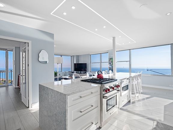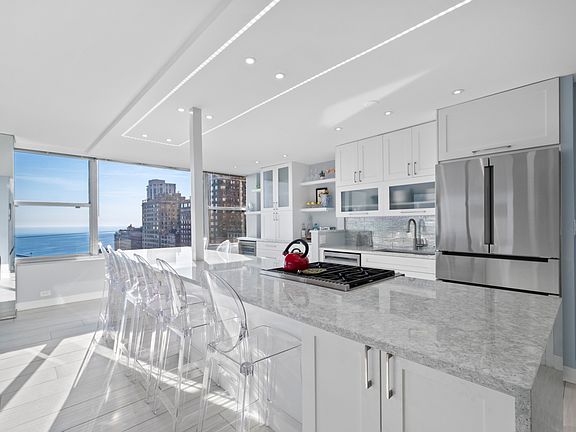 Welcome to 1000 N Lake Shore Dr. #1808-an amazing east and north facing corner unit condo where oversized windows showcase panoramic views of Lake Michigan. This beautifully renovated, 2-bedroom, 2-bath home features a stunning chef's kitchen with a massive 14' quartz island with a double waterfall edge, Wolf gas range, Bosch refrigerator, wine fridge, hidden coffee station, and sleek custom cabinetry. Both bathrooms are luxuriously updated with spa-like finishes, including push-button showers, LED lighting, and a designer Robern uplift medicine cabinet. A rare balcony offers fresh-air city living, while radiant heated floors, recessed lighting, and glass-paneled doors add warmth and sophistication. The building features a 24-hour doorman, valet garage parking, and in-building dry cleaner. Steps from Oak Street Beach, Mag Mile shopping, dining, and transit, this residence blends modern elegance with the best of Gold Coast living.