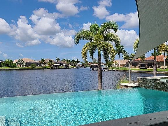 Ultimate intersecting-canal view – 147 ft Gulf access. Modern, well-maintained pool home on an oversized, SW rear exposure lot in desirable NW Cape. Seamless indoor-outdoor living: large sliders open to a spacious lanai with infinity-edge solar-heated saltwater pool + spa, outdoor kitchen, and private dock with 10,000-lb lift. Great-room layout with water views from kitchen, dining and primary; generous guest rooms that can double as office/flex. Enjoy daily wildlife (manatees, dolphins, mullet) and fast boating: ~25 min to Matlacha Bridge. Quality finishes, paver drive, meticulous landscaping. Ideal for sunset entertaining; Oct–Apr true Florida indoor-outdoor lifestyle.