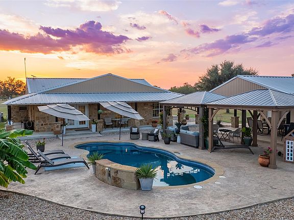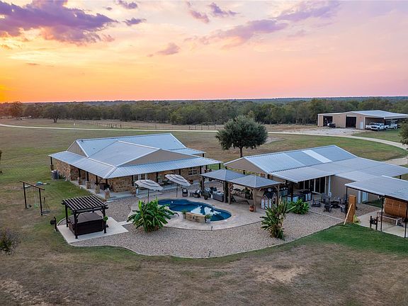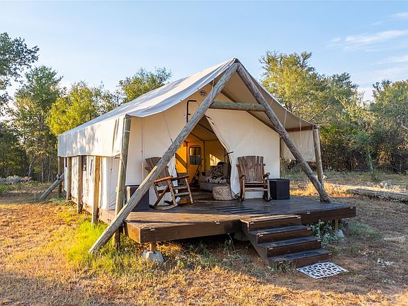 The primary home, built in 2013 and expanded in 2020, offers 2,949± SF with 4 bedrooms, 3 bathrooms, and wide porches that frame long views of the countryside. An attached 1,000± SF garage suite with its own bedroom, bathroom, and office provides privacy for guests, family, or caretakers. The second residence, completed in 2024, features 1,842± SF, 3 bedrooms, 2 bathrooms, and contemporary open-plan living—perfect as a guest house or income-producing rental. A glamping tent adds a unique retreat element, offering a luxury camping experience with modern finishes and full amenities. Tailored for equestrian use yet versatile in function, the ranch features a full suite of horse facilities including a barn with stalls, goat pens, and a professional grade roping arena. Cross-fenced pastures and working pens provide flexibility for running cattle or other livestock as needed. For hunting and wildlife enjoyment, the property is equipped with tree stands, feeders, and two stocked ponds that attract native game including whitetail deer, turkey, dove, and seasonal waterfowl. A large, covered metal barn near the glamping area offers ample space for equipment, hay, or gatherings, while multiple utility sheds support daily operations. With a layout designed for both function and leisure, the ranch easily transitions between working land and private retreat. Two stocked ponds provide fishing and support for native wildlife. A reliable domestic well services both homes and ranch infrastructure, while natural drainage helps maintain healthy pastures. The property is set up for bow hunting and wildlife viewing, offering a low-pressure environment for game management or relaxation.