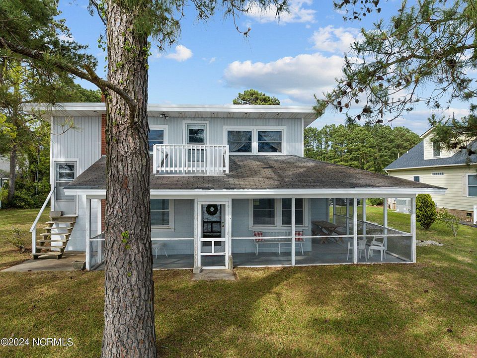 WATERFRONT COTTAGE ON THE PAMLICO - This beautiful property boasts approximately 212 feet of waterfront. Built in 1950, the cottage has retained much of its original charm. The 1,280 sf of living space (NO HVAC), has a propane gas stove on the main level that will keep the house comfortable in the winter. The house has beautiful heart pine paneling throughout. A small kitchen with a large porcelain sink, stove/oven and a new dish washer, (Dishwasher will need to be installed). Just off the kitchen is space for dining, a cozy living room and a walk-in closet. A full bath just off the living room can also be accessed from outside, handy when coming in from having a fun day on the river. As you head upstairs, there is plenty of space to have a gallery wall or shelves to hold your favorite books. 2 bedrooms upstairs, each with their own half bath and more beautiful heart pine paneling. A little added feature is a small balcony where you can look out over the Pamlico River. Downstairs, a covered porch flanks the front of the house and down the side to the kitchen allowing for indoor/outdoor living that is perfect for entertaining. The expansive views of the Pamlico River boast breathtaking sunrise and sunsets that will leave you in awe of the beauty that surrounds you. Property has a vinyl bulkhead and a covered boat house, the home could use some TLC but has great bones. Quick access to the ICW and Pamlico Sound. The possibilities are endless, No HOA or Restrictions.