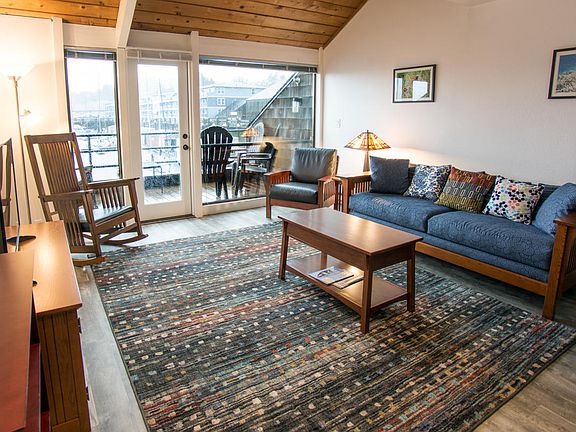 Don't miss this opportunity for a freshly renovated and fully furnished waterfront condo at Embarcadero Resort. The condominium was renovated Spring 2019 and includes all new flooring and a modern kitchen with stainless-steel appliances. The condo is spotless and ready for you to enjoy or rent out for income. This is a ground level unit with direct parking lot access. The deck overlooks the marina and has a view of the Yaquina Bay Bridge. The condo is fully furnished and everything in the condo is included in the sale. The remodeled kitchen is fully stocked and boasts a tile backsplash, butcher block counter, and butcher block dining island. There is plenty of room in the new kitchen cabinets for all your storage needs.