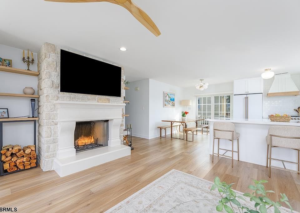 Welcome to this recently renovated 2 bed / 2 bath home with a modern farmhouse feel. Completed just last year, inside offers the freshness of new construction with thoughtful upgrades throughout. Inside, a custom-built wood-burning fireplace by Stone Mountain Castings creates a warm focal point for the living space. The kitchen features sleek Café appliances, a custom range hood, Delta sink faucet, a deep farmhouse sink, and thick mitered-edge quartz countertops. Durable luxury LVP flooring runs throughout the home. The garage includes a new automatic door opener and a built-in 220v EV charging station. Outside, you’ll find a circular driveway, an in-ground automatic sprinkler system, and a custom-built redwood sauna (4–6 person)—ideal for post-beach relaxation or cozy winter evenings before warming up by the fire. From the front porch, you can even catch views of the golf course. The corner lot offers side and front yards ready to be fenced, perfect for pets or kids. The layout also provides flexibility: the oversized second bedroom can be converted into two rooms, creating a 3 bed / 2 bath setup if needed. Location perks—a short bike ride or walk to Brigantine’s best beaches, and just a couple of blocks from the seasonal Saturday farmers market. This home blends modern luxury with easy coastal living. Move-in ready!