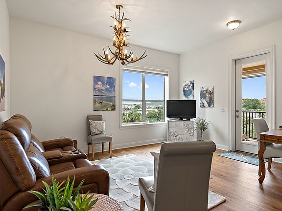 Beautifully updated light and bright 3rd-floor Hill Country Contemporary condo at The Waters in Horseshoe Bay with lake views from all primary rooms. Southeast exposure views overlooking Lake LBJ and the surrounding Hill Country from inside the unit as well as the patio with operable screens. Tastefully appointed with Hickory wood floors in the living, dining, and bedroom, and tile floors in the kitchen and bathroom. The kitchen features stainless steel appliance package and granite countertops, Hickory wood cabinets with soft close doors and drawers as well as in cabinet lighting and pantry cabinet. Walk to the Yacht Club, Resort Marina, and other amenities that make Horseshoe Bay a desirable place to live full-time or on vacation. Short-term and long-term rental potential. The HVAC unit and water heater replaced in 2021.