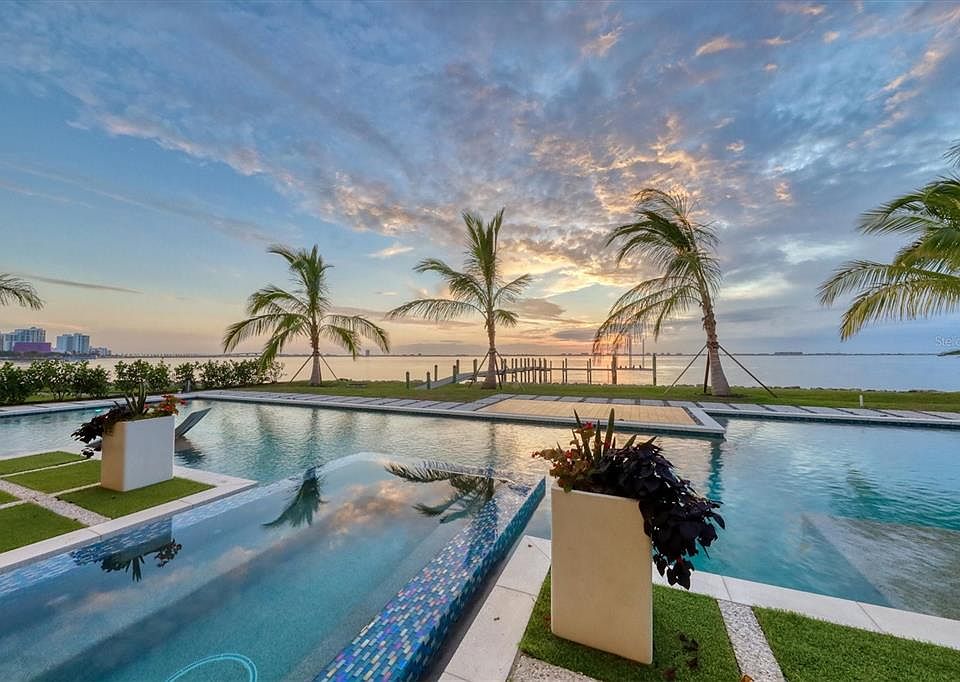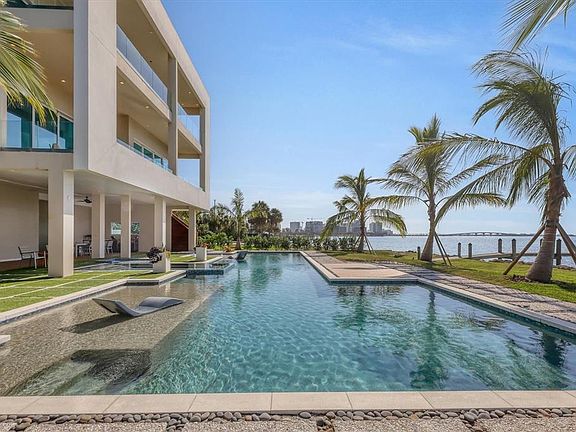 WATERFRONT MODERN ESTATE | DEEP WATER DOCK | ONE MILE FROM DOWNTOWN SARASOTA. Welcome to one of Sarasota’s most desirable waterfront addresses. Built in 2017 to the highest structural standards, this modern estate was engineered to endure Florida’s toughest hurricanes — set on 75 reinforced concrete piles with solid concrete exterior walls, slabs, and roof, and impact-rated glass throughout. Located within an exclusive gated community just one mile from downtown, the property enjoys direct views of Sarasota Bay, the Ringling Bridge, and the city skyline. Steps away lies The Bay Park, a new world-class 53-acre waterfront park and nature preserve featuring scenic walking trails, kayak launches through the tranquil mangroves, open-air events, and year-round recreation. Enjoy boating from your private deep-water dock equipped with a 13,000 lb lift, or relax by the resort-style pool featuring a 12-person spa and expansive sunshelf surrounded by lush tropical landscaping. Inside, every detail reflects European refinement and contemporary luxury: Italian interior doors, a German top-of-the-line kitchen, and porcelain tile imported from Spain create an ambiance of elegance and sophistication. Additional highlights include a smart home automation system, a private elevator serving all floors including the rooftop level, and panoramic bay views from nearly every room. With The Bay Project, Downtown Sarasota, Bayfront Park, and the Ringling Bridge all just moments away, this residence perfectly blends architectural excellence, modern design, and a premier waterfront lifestyle.