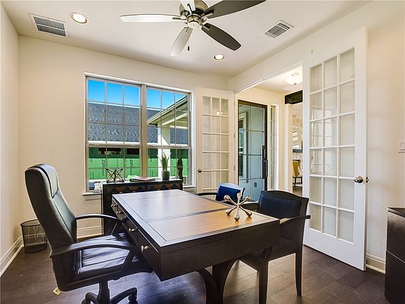 Corner cul-de-sac lot Courtyard at entry w/ sitting area and iron front door Front & rear lawn maintenance included Custom Benedettini cabinetry Hardwood floors in main living areas 12' great room ceiling 8' kitchen island 9 windows in main living area Extended living area & covered patio w/ T&G stained ceiling Secondary bedrooms can fit King size beds Master Bath w/ skylight, double vanities, mirrors to ceiling, frameless glass mudset shower & freestanding tub Tile to ceiling in all showers
