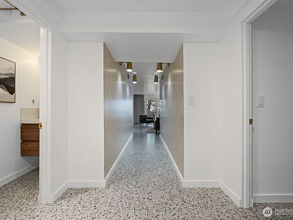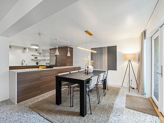 Experience the epitome of mid-century modern city living with this meticulously crafted condo where style and convenience converge. The exquisitely designed kitchen with luxury appliances and bespoke lighting opens up to the dining and living room, accentuated by brilliant white terrazzo floors and natural light. The primary bedroom boasts a custom walk-in closet and ¾ bath while the second bedroom offers WFH opportunity or room for guests experiencing Seattle’s best. Enjoy the dramatic dedicated elevator access via the Union St. entrance or enter via your gated, tree-lined ground-level terrace. Dedicated garage AND driveway parking, amenities, and ample storage. City living at its finest awaits!