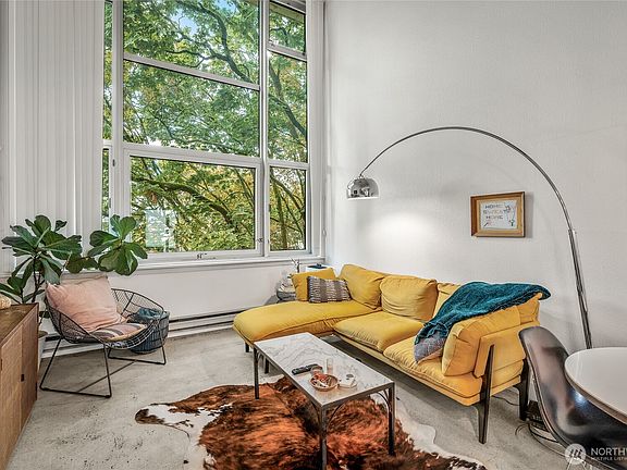 Architect-designed loft at the Talisman, a midcentury icon by the Space Needle’s architect. Soaring 15’ ceilings, oversized new windows, and exposed concrete floors create light-filled drama. Kitchen fully updated in 2023 with designer tile, Bertazzoni cabinet-front refrigerator, dishwasher, and convection range, plus a bar nook under the stairs. Loft bedroom features luxury plank flooring and a walk-in closet larger than expected. Updates include modern ceiling fan, bathroom flooring, and upgraded electrical panel. Secure building with gym, sauna, laundry, deeded parking (#13), and storage. Convenient central location with access to Paramount Theatre, convention center, transit, I-5, 520, and light rail. Ask about the 2.75% assumable loan!