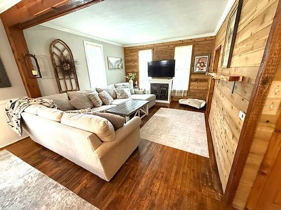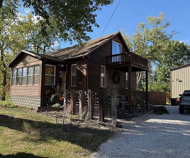 Entrance: Front entrance is through heated porch with thermopane windows. Living Room: Antique wooden floors, 2 cedar accent walls, other walls painted. Beamed ceiling between dining room and living room. Dining Room: Continuous decor with cedar walls, cove molding, one wall grey/white wainscot with farmhouse look, all open floor plan to living room, dining room, and kitchen. Kitchen: White cabinets, tan stone backsplash, tan granite-look laminate counter top. Appliances include gas 5 burner range with griddle, dishwasher, side by side refrigerator. Cedar walls, laminate floor, breakfast nook area has large window with live edge window ledge that overlooks raised wooden deck with treated wood and iron spindle railing. Bedroom: Wood floors, one feature wall of shiplap, other walls painted beautifully in repose grey with crown molding. Restful and peaceful! Bedroom: Repose grey painted walls, white trim, black ceiling fan. Oak flooring. Bath: Vinyl floor, white fixtures, white vanity, grey walls. UPSTAIRS: Master suite includes bedroom and full spacious bath (the bath is presently under construction). It will have white fixtures, grey wall, vinyl floor. The existing Master Bedroom has grey plush carpet, light grey walls, built in sconces by bed and above ceilings. Master bedroom has French patio doors opening up to an upper deck that faces east for morning sunlight! Basement: Dry basement has GFA and CAC, plus a new breaker box recently installed. Entire basement will be painted white by closing. Yard: Numerous trees for privacy and the yard area encompasses 4 city lots. Large all steel shop with water and sewer, led lighting overhead and two separate doors, facing south and north for convenient drive through. COMMERCIAL zoning for this house offers a multitude of business: auto repair shop, food service, even use the metal shed for parties! Your business plan awaits.