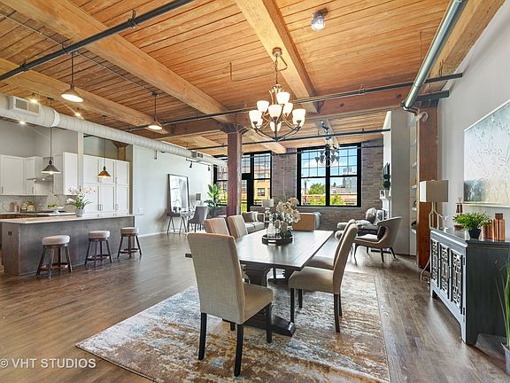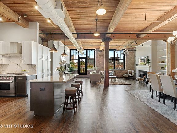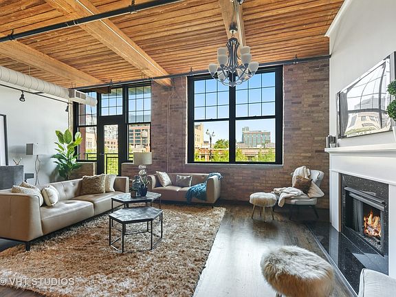 Located in the heart of the West Loop, this renovated, over 2000 square foot authentic loft overlooks Randolph Street with a West Loop view. Architectural details include 12' exposed timber ceilings, columns, and brick walls. Interior designs feature open kitchen concept with center island, quartz counters with grey veining, full height quartz backsplash, Wolf high output range, Bosch culinary hood, refrigerator and dishwasher, all wood white upper cabinetry and lower grey cabinetry. Cabinet pantry storage. Wall of repurposed barn wood. Vast living and dining areas will fit three to four seating areas comfortably. All hardwood floors in a dark walnut stain. Fireplace with granite hearth, mantle and built in book cases on each side. Private balcony. Second bathroom with steam shower, frameless glass, black penny floor tile, white subway tile, Kohler fixtures. Bedroom with contemporary wainscoting. Master suite features large walk in closet, dual vanity, quartz counters with grey veining. Large, black hexagon floor tile, rain shower with bench. A tandem heated garage parking safe is included for two cars in the list price.