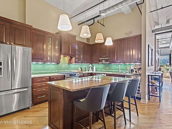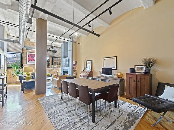 The perfect loft with no wasted hallway space. This split bedroom/bathroom floor plan features real "tongue and groove" hardwood floors on a diagonal, living room fireplace, 11' x 5' recessed terrace facing south and utility room. This residence features a chef's kitchen, an entertainment kitchen with large island, straight edge granite counters, KitchenAid series stainless steel appliances: French door refrigerator with ice/water dispenser, gas range, wine cooler. All wood cabinetry in medium walnut stain. Upper cabinets with tempered glass panels. Brushed stainless steel drawer/cabinet pulls. Under cabinet lighting, glass subway tile backsplash, deep single sink and garbage disposal. Master suite with raised dual vanity, straight edge granite counter top, oversized shower with bench, handheld and storage niche. Living and dining areas fits three seating areas. 15' x 11' second bedroom, tub, hardwood floors and pedestal sink. 14' exposed, barreled concrete ceilings, south facing home flooded with light from oversized commercial grade windows and exposed concrete columns and brick. Both bathrooms freshly painted, newly carpeted master bedroom. Storage space located behind elevators in basement. Garage heated parking available for purchase @ $15,000. 24 hour doorstaff, onsite management and maintenance. New Sundeck, Two lobbies. Walk to any restaurant, lounge, night life or grocery in the West Loop.