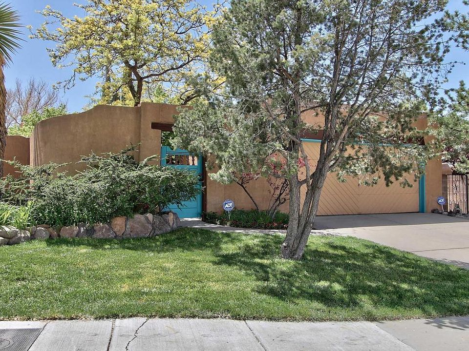 Oh so charming casa nestled on a lush & private lot in wonderful NE location. From the lovely entry courtyard to the private tranquil backyard, this home exudes character & style. The expansive great room has classic southwestern details including beam ceilings, grand fireplace, & 2 sets of French doors to a cozy covered patio. Gracious dining room tucked between the great room & kitchen, ideal for entertaining. Wonderful kitchen w/ built in desk & china cabinet, & a bay window area perfect for a sitting space or kitchen table. Floor plan has split bedrooms, perfect for privacy in a smaller space. Enchanting master suite is a brilliant retreat w/ kiva FP, built in shelves, & a door to the back patio. If you are looking for charm and southwestern character in the NE heights, this is it!