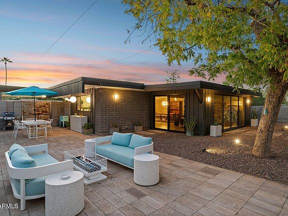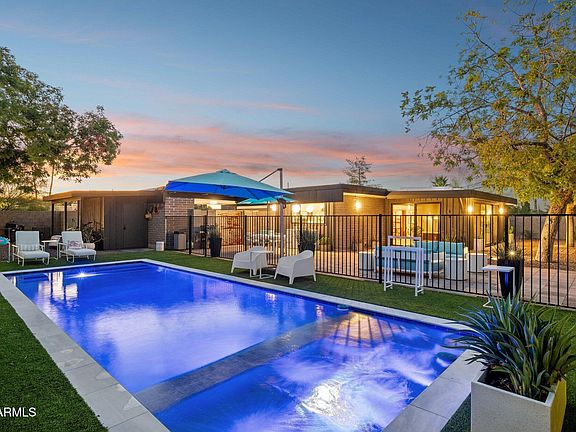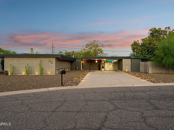 This treasured architecturally significant c.1961 residence embodies the essence of mid-century modern design with Alfred Newman Beadle's influence, while embracing thoughtful updates that enhance its appeal. Preserved and elevated by successive stewards, the true spirit of this modernist residence has grown richer with every passing year. The 'Saguaro x-100' plan is one of 4 cactus-themed desert modern designs originally associated with Al Beadle and A-1 Builders. Paradise Gardens is referenced to be the only tract housing designed/influenced by Alfred Newman Beadle, AIA. Iconic Al Beadle architectural elements have been preserved, including signature flat roofline with 'sun flap' overhangs, clean lines with sand-blasted block construction, decorative shadow block accents, expanses of glass and an inimitable indoor-outdoor connection. This home greets you with exceptional curb appeal, set on a cul-de-sac lot, tucked away from busy streets, offering a curated desert landscape and glowing architectural lighting.