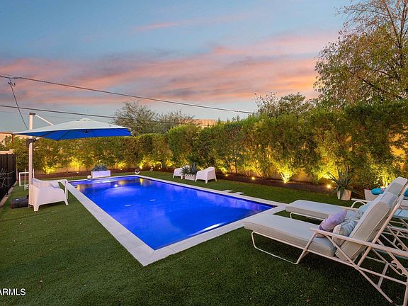 The rear yard is primo- a true extension of the home, thoughtfully shaped over time to offer both beauty and purpose. The outdoor spaces are as artful as the interiors. The $75,000 fully-custom designed contemporary heated pebble tec pool and flush spa by SunState Pools has transformed the rear yard into a minimalist desert retreat perfect for year-round Sonoran desert living. The pool stretches in an elongated rectangular form; a subtle homage to Beadle's linear design philosophy. Within its modern geometry lies a hidden indulgence: a heated, flush spa that accommodates 10+ guests. Elongated benches at each end of the pool invite lingering afternoons of conversation and relaxation, transforming the yard into a true resort-style retreat. Gorgeous marble coping surrounds the pool. Thoughtfully composed landscape design creates vignettes in every direction and keeps desert resilience in mind, incorporating mature trees, tall privacy hedges and synthetic turf for year-round vibrancy. A paver-lined patio along the pool creates a versatile setting for gatherings, dining and outdoor relaxation while strategic lighting creates an ambiance that shifts beautifully from day to night. Artisan-crafted heavy steel gates are adorned with playful hardware.