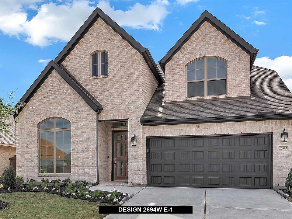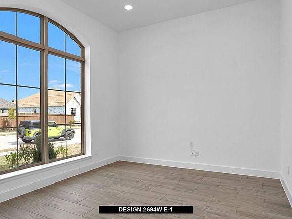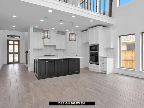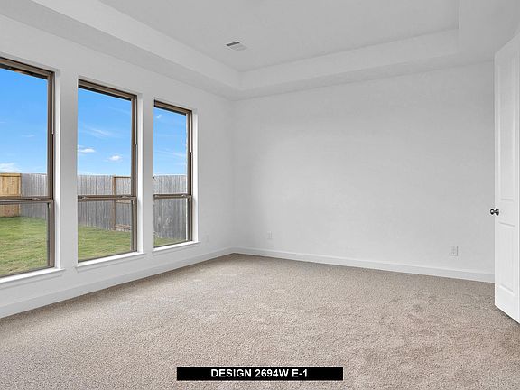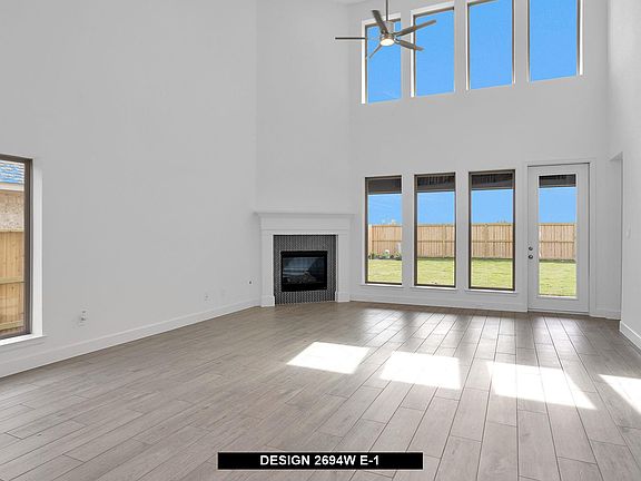 Home office with French doors and 11-foot ceiling set at two-story entry. Open kitchen features deep walk-in pantry and generous island with built-in seating space. Dining area opens to two-story family room with a wood mantel fireplace and wall of windows. Primary suite includes bedroom with 10-foot tray ceiling. Double doors lead to primary bath with dual vanity, garden tub, separate glass-enclosed shower and large walk-in closet. An additional bedroom is downstairs. Secondary bedrooms and game room with 10-foot tray ceiling are upstairs. Covered backyard patio. Mud room off two-car garage.