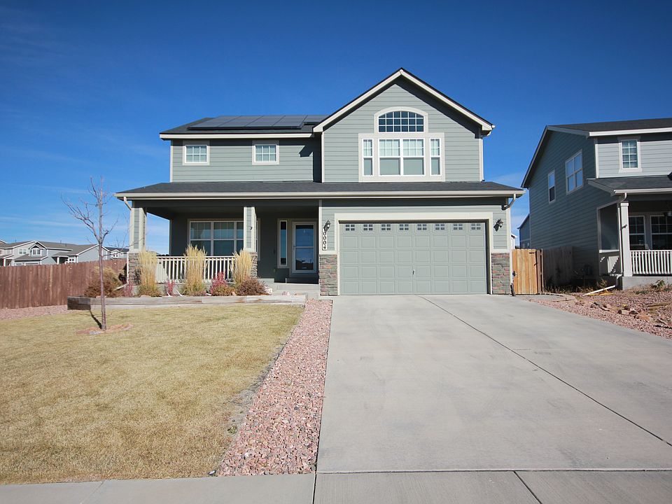 This charming home sits on a spacious, fenced-in corner lot with a welcoming covered front porch. The three-car tandem garage offers ample storage and wall mounts for all your tools. Inside, you're greeted by a decorative wall leading up the stairs to the loft and bedrooms. The main floor features an eat-in kitchen with slab countertops, a large island with sink, stainless steel appliances, a roomy walk-in pantry, and stylish lighting. The garage entry leads into a mudroom and down to the unfinished basement. Upstairs, the loft can serve as a second family room, office, exercise space, or hangout area. The secondary bedrooms share a full bath with double vanities, while the owner's suite boasts two closets flanking a built-in cabinet area, a large picture window with stunning Colorado mountain views, and a private bath with walk-in shower, separate tub, and double vanity. The conveniently located upstairs laundry room keeps chores easy. This spotless home is truly move-in ready!