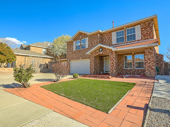 This gorgeous four-bed / two-and-a-half-bath home boasts an abundance of upgrades. This 2-story brick beauty is bright, open & spacious! Enjoy the Gas fireplace in the formal dining and living room. The Great room/Family room offers built-in shelves & overlooks the 2016 remodeled Chefs delight kitchen with granite countertops, a kitchen island, lots of storage, and energy-efficient newer appliances. Upgrades include 1 remodeled full bath, upgraded powder room, wood flooring, new roof (2019), refrigerated air/heat, low maintenance concrete stamped, and walled backyard for privacy. The Master suite w/ inviting balcony, views of majestic Sandia mountains, Spa style luxurious bath, walk-in closet. Queen room with a walk-in closet. All spacious bedrooms co