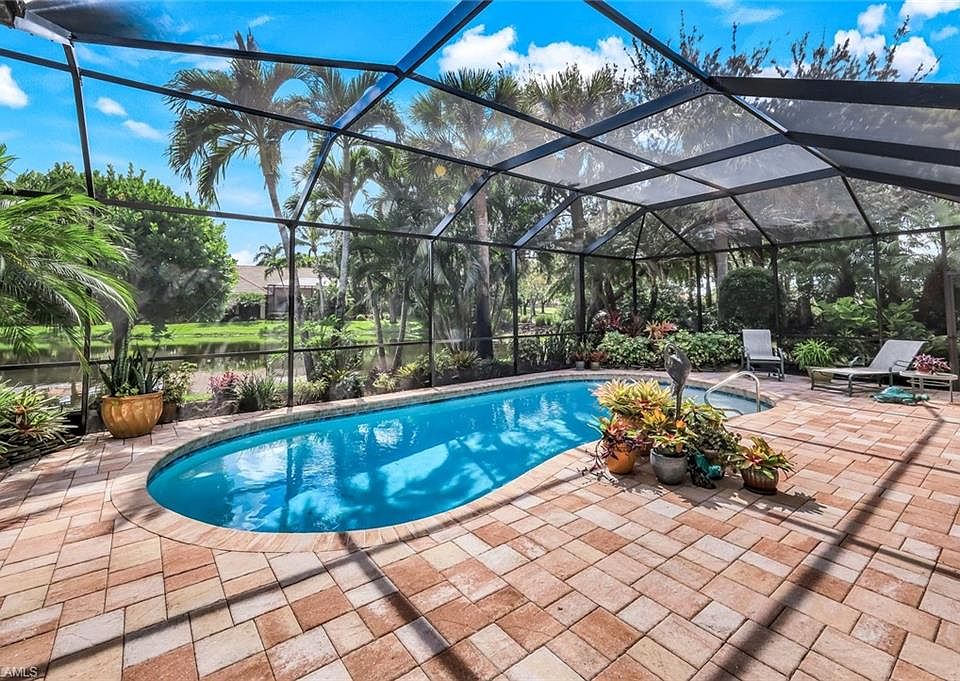 This Custom Estate Home captures the VERY BEST of Shadow Wood at Brooks living - Luxury, Location and Lifestyle. The prestigious Idlewilde neighborhood is one of Shadow Wood’s most prized locations, uniquely situated directly between the Country Club and the Commons Club. Picture yourself a short walk (0.3 miles/10 minutes) from the SWCC Clubhouse or a just a 12 minute stroll (0.5 miles) The Health & Wellness Center… Now that’s convenience! This one-of-a-kind custom Marvin-built home offers 3 spacious bedrooms, 3.5 bathrooms, and an elevated lifestyle defined by elegance, comfort, and attention to detail. From the moment you arrive, the wavered brick driveway and ornate double glass front doors set the tone for what lies within. Step into the grand foyer, where soaring ceilings, abundant natural light, and neutral ceramic tile flooring create a warm and inviting atmosphere that flows throughout the main living space. Designed for the culinary enthusiast, the chef’s kitchen features granite countertops, a large center island, custom wood cabinetry with soft-close drawers, a natural gas range, and double ovens — perfect for hosting and everyday living. The primary suite is a true retreat, complete with tray ceilings and crown molding, sliding glass doors to the lanai, dual walk-in closets, and a luxurious ensuite bathroom featuring separate vanities, an oversized walk-in shower with a massive mitered glass window, separate jetted Jacuzzi tub, and private water closet. Step outside to your SOUTHERN EXPOSURE lanai, where a resurfaced sparkling pool with sun shelf, newly rebuilt pool cage, and Kevlar hurricane shutters make year-round enjoyment effortless. A convenient half bath by the pool ensures seamless entertaining. Additional highlights include a NEW modern flat tile ROOF (2022), Oversized 2.5-car garage with NEW refrigerator (conveys with sale), custom ceiling details with crown molding throughout, Plantation shutters and much more. Set within one of Shadow Wood’s most desirable enclaves, this exceptional home offers privacy, peace of mind, and proximity to all of the community’s world-class amenities. Shadow Wood Country Club offers 54 holes of championship golf, tennis, bocce, world-class dining—all within your community. A brand-new Lifestyle Amenity Center is underway, featuring six INDOOR pickleball courts, two resort-style pools, restaurant & bar, racquet pro shop, and more. Residents also have access to THE COMMONS CLUB, featuring a private beach club, state-of-the-art fitness center, luxury spa, private restaurant, endless social & recreational opportunities.Don't miss your chance to own this meticulously maintained masterpiece!
