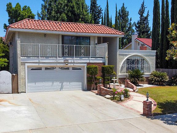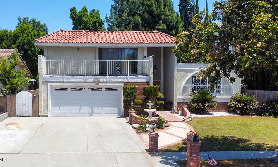 Spacious Chatsworth cul-de-sac home for sale with 4 bedrooms, 3 bathrooms (including a first floor bedroom and bathroom), 2 fireplaces, and an attached 2 car garage with extended driveway. The brick lined pathway with an electric water fountain leads to the front remodeled double door entry with sky window and crystal glass chandelier. The formal living room features crown moulding, window shutters, and a large fireplace with brick surround and wood mantle. The dining room with glass chandelier and wood flooring leads into the breakfast nook and recently remodeled kitchen featuring recessed lighting, newer cabinets, newer granite counters, tile flooring and beautiful backyard views. The family room shines with a ceiling fan, wet bar, secretary nook, laminate flooring, and a second fireplace with brick surround and wood mantle.Down the hall is the first floor bedroom, a bathroom with shower, laundry area and garage access. Stairway leads to the main bedroom with dual door entry, ceiling fan, outdoor balcony, dual closets (one walk-in closet), and main bathroom with dual sinks. Additional features include air conditioning, newer roof (2 years), backyard 40 foot covered patio, front and rear yard sprinkler systems, and a special (independent from house) water meter for exterior water supply saving on the water bill. This home is conveniently located minutes away from freeway access, Chatsworth Parks, as well as Westfield Malls featuring a wide range of shopping, dining and entertainment.