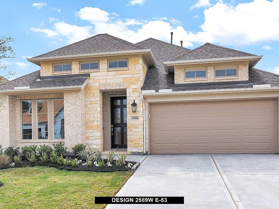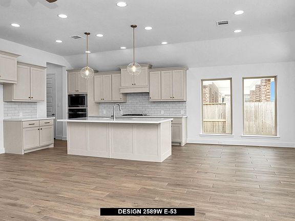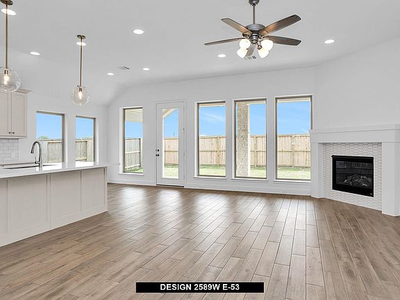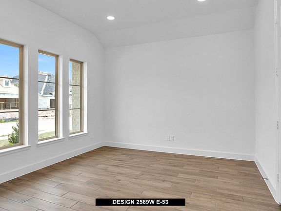 Home office with French doors set at entry with 12-foot ceiling. Extended entry leads past formal dining room to open family room, kitchen and morning area. Family room features a wood mantel fireplace and wall of windows. Kitchen features island with built-in seating space. Primary suite with wall of windows. Dual vanities, garden tub, separate glass-enclosed shower and large walk-in closet in primary bath. A guest suite with private bath adds to this four-bedroom design. Extended covered backyard patio. Two-car garage.