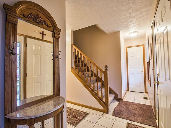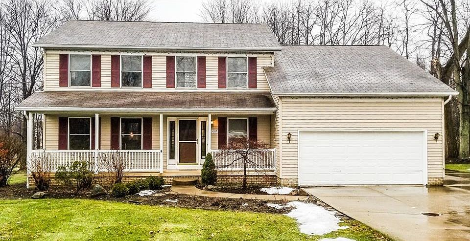 Built in 2000 this front porched colonial is situated on a large lot in Twinsburg but has a Macedonia mailing address. The home features a spacious floor plan with a living room and dining room for entertaining but also has a large eat in kitchen and a freshly revamped two story family room with gas fireplace. Abundant windows overlook the back yard with a partial privacy fence while affording natural light during daylight hours. The kitchen comes with plenty of cabinets and counter space. A pantry allows for extra food or appliance storage. There are sliding doors in the eating area which lead to the deck and spacious patio. The second level features 4 bedroom all with new carpet ( December 2017). There are 2 full baths on this level with an oversized master bath allowing for his and her sinks as well as a private bathing area. A first floor laundry room is located off the kitchen. The lower level has a rec room great for the kids or a man cave and plenty of storage space. Part of this level is being used as an exercise or work out space and there are cabinets and a sink on this level which could allow for an extra pantry area. The wide driveway and extra parking pad to the right of the garage allow for plenty of parking when entertaining is done or storage of a boat or recreational vehicle. Seller offering $2000 towards kitchen flooring or closing costs.
