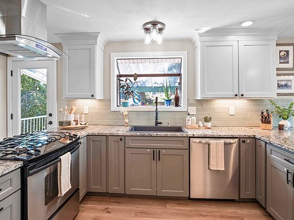 Beautifully updated light & bright Spokane Valley home with NEW kitchen, coffee/beverage center, walk-in pantry w/barn door, LVP flooring, sunroom, 2 beautiful gas stoves, luxurious claw foot soaking tub, heated floor in primary bathroom, built-in laundry center, designer backyard & garden, large wood-shop w/wood stove, & bike/ski shed w/power & gas heat. Ample large windows, an awesome layout, and a huge deck make this home feel spacious and airy with excellent flow. Landscaping was professionally designed and the property has the coolest romantic vibe! 7 zone sprinkler & drip system with new wifi/bluetooth programmable controller. Wired for hot tub. Fruit trees/plants - peach, cherry, apple, raspberry, and blueberry. All appliances stay!