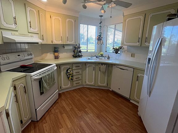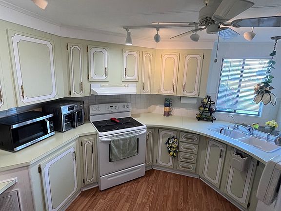 This charming two-bedroom, two-bath home is located in the gated golf community of Lake Fairways.    Step inside to find a unique kitchen and a spacious dining area with a built-in hutch, perfect for gatherings. The open floor plan leads to a large, light-filled living room. Just off the living space, you'll enjoy a beautifully enclosed, air-conditioned lanai with tranquil water views.    The primary suite features an extra-large walk-in closet and an ensuite with an easy-access shower. A comfortable guest bedroom and bath are ready to welcome family and friends. Additional highlights include a storage shed with washer and dryer for convenience.    Lake Fairways is a 40+ age-qualified community offering resort-style amenities:       •   Sparkling pool & jacuzzi     •   Beautiful clubhouse with full social calendar     •   Tennis, pickleball, bocce ball & horseshoes     •   Challenging 18-hole golf course    Whether you're a seasonal snowbird or a year-round resident, this home is a perfect fit.     The property sits on a leased lot with a monthly fee of $1,369.   Contact  DeeAnn today to schedule your personal showing. Out-of-town? FaceTime tours are available!