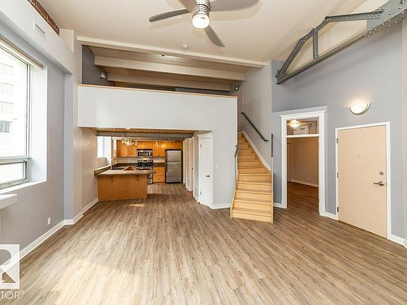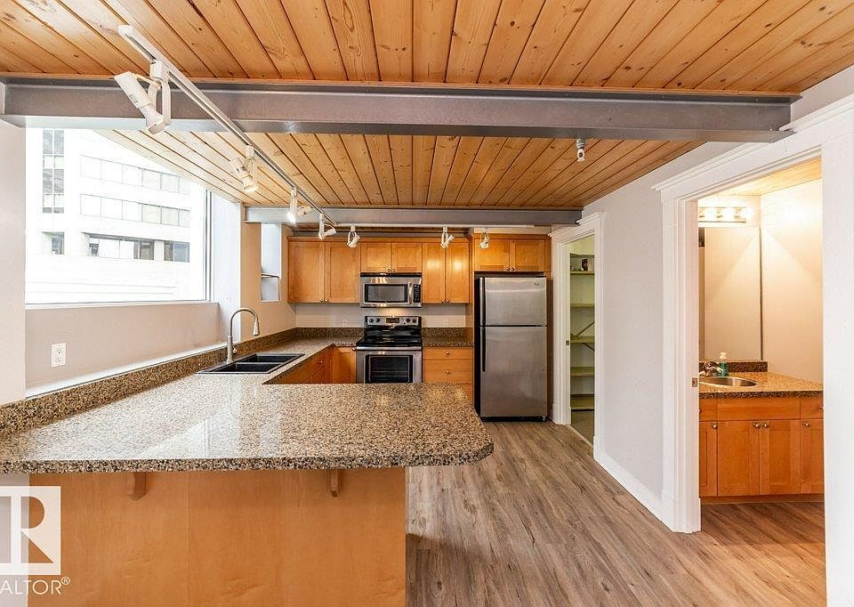 OUTSTANDING LOCATION! This Churchill Exchange condo is located in the heart of Edmonton, steps from Ice District, The Winspear, Art Gallery, 104th Street Farmer’s Market & Churchill Square. Almost 1300 sq ft of living space including the spacious balcony. This one bedroom plus loft condo is in a gorgeous historical, art deco building. Enjoy 16' open beam ceiling and exposed brick. Open stairway to the loft level with a 4 pce ensuite. The main floor features a bright kitchen with granite countertops and stainless steel appliances, an open living room with gas fireplace and large second bedroom. Massive windows make this a beautiful bright condo. There’s a huge balcony off the living room and a shared roof top deck with amazing views of the city. Underground, secured parking is heated! The ultimate Downtown location in a quiet concrete building!