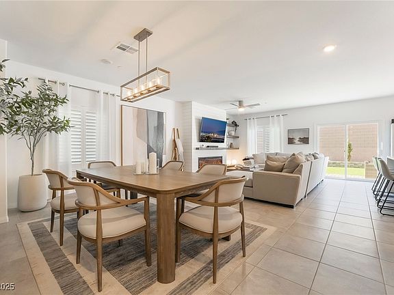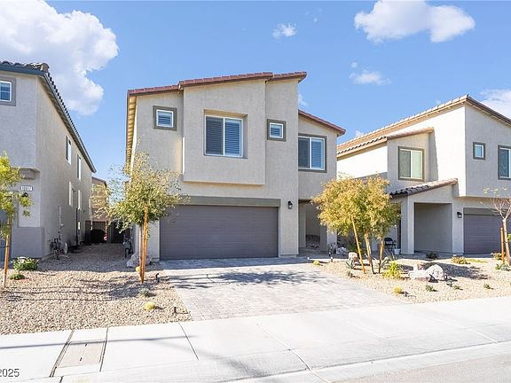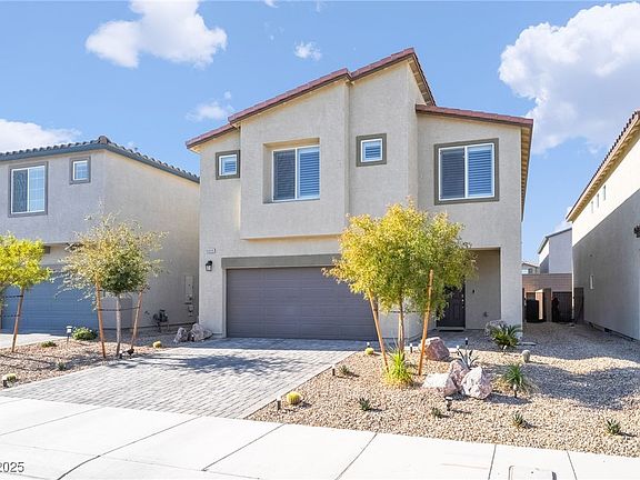 Step into modern elegance in Southwest Las Vegas! This newly built 2023 DR Horton home boasts designer finishes galore! Every corner of this home has been meticulously upgraded, from the premium flooring to the custom light fixtures. Inside, the kitchen boasts Calcutta quartz waterfall counters, backsplash, and under cabinet Alexa smart lighting. The living room features a media wall and fireplace, MDF wooden shutters throughout. Upstairs, wooden flooring extends through the loft and pathway, with a custom media wall and built-in bookcase. The primary suite includes a slat media wall, remodeled bathroom with quartz counters, new sinks, walk-in shower, and a Closet World custom-built closet. Additional features include upgraded bathroom vanities, silver LED ceiling fans, and a full-home white paint interior. Yard features new plants, flower beds, trees, turf, and driveway lighting. Why settle for ordinary when you can have extraordinary? Experience unmatched style—schedule a tour today!