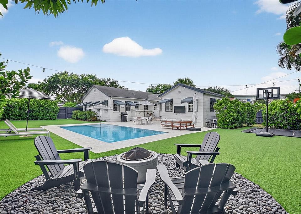 A rare blend of charm, space, and style, this beautifully furnished annual rental is located in one of West Palm Beach's most desirable neighborhoods. Just minutes from downtown but tucked away on a quiet, tree-lined street, the home offers the kind of indoor-outdoor living experience that's nearly impossible to find in the heart of the city. Inside, you'll find a bright and airy floor plan centered around a stunning, fully renovated kitchen. The oversized island, sleek quartz counters, custom cabinetry & high-end finishes make it both functional & visually striking, perfect for everyday living or entertaining. Both bathrooms have been tastefully updated with a clean, modern aesthetic that complements the home's timeless charm. But what truly sets this home apart is the expansive backyard an exceptionally rare find in such a central location. The lushly landscaped outdoor space is a private oasis complete with a saltwater heated pool, cozy fire pit, outdoor TV, and even an in-ground trampoline, perfect for both quiet relaxation and lively entertaining. There's also ample flex space for grilling, dining, and hosting outdoor gatherings, making it feel like your own personal resort. Pool and landscaping care are included, offering low-maintenance luxury year-round.