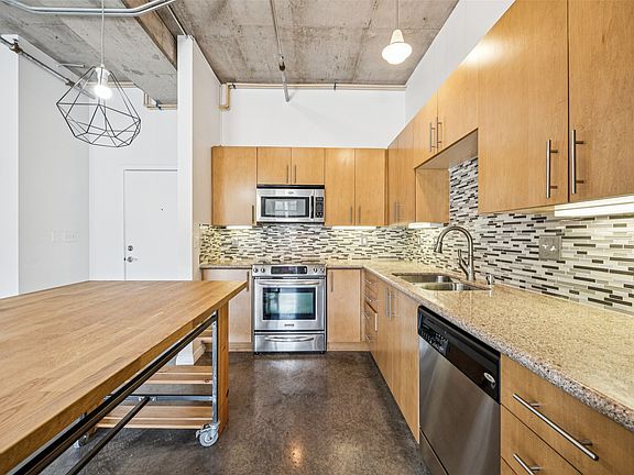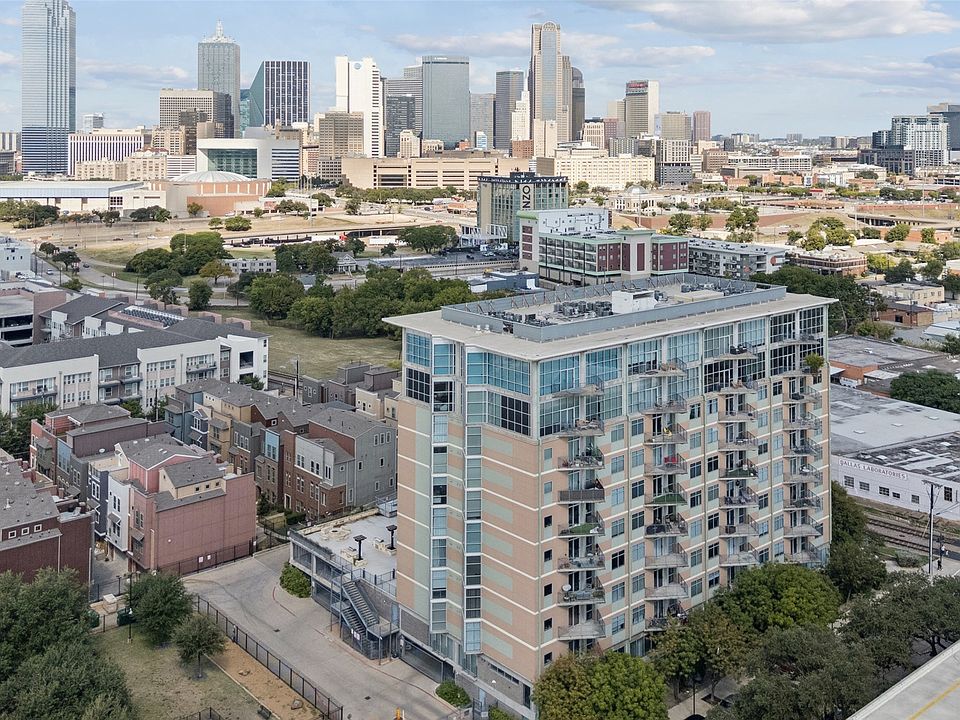 Welcome to modern loft living in The Cedars with stunning skyline views! This industrial 2-bedroom, 2-bath condo captures the best of urban living with its open-concept design, concrete floors, 10-foot ceilings, and floor-to-ceiling windows allowing natural light to flood this unit. The kitchen offers sleek finishes, stainless steel appliances, an island, milestone countertops, generous storage, and a one-year-old refrigerator that remains with the unit. Step outside to the private balcony for coffee or cocktails with a view. The spacious primary suite features an ensuite bathroom with a double-sink vanity and a custom walk-in closet. The washer and dryer are also included. Community amenities on the second level deck showcases a stunning view of downtown Dallas and include secure entry into the building, a resort-style pool and heated spa, fire pit, outdoor covered lounge area, grilling area, dog run (on first level) and secure parking. Perfectly positioned a block to the DART rail station and next to a neighborhood dog park, this home delivers convenience and connection with restaurants, coffee shops, and entertainment just steps away.