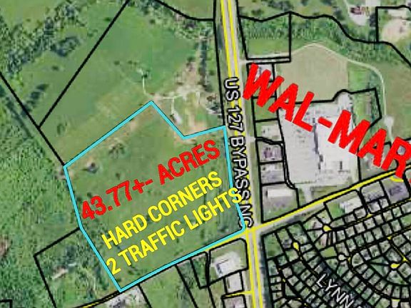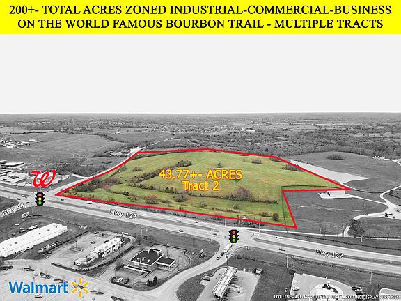 HARD CORNERS @ MULTIPLE TRAFFIC LIGHTS AND DIRECTLY ACROSS FROM WAL-MART, WAL-GREENS, AND MANY MORE—TALK ABOUT LOCATION, LOCATION, LOCATION!!! This exceptionally located property sits at the intersection of HWY 127/HWY 44 and directly on the World Famous Bourbon Trail. There is currently direct access from the Wal-mart intersection into the property and additional entrances are possible. Property contains a total of up to 200+- acres and is zoned for Industrial-Business-Commercial mixed uses. Property lends itself well for approximate 50 front acres to be utilized for commercial (Restaurants? Hotels? Retail? Brewery? Service Stations?) and approximate 150 acre rear portion to be utilizes for industrial (Bourbon Warehousing? Manufacturing plants? Distilleries? Industrial Factories?) Huge natural gas, electric, public water, public sewer, multiple manholes all available at the property. Seller may consider selling in 20 acre tracts minimum on certain portions of the property. Call today to schedule your showing!