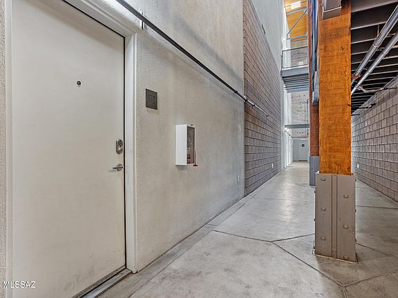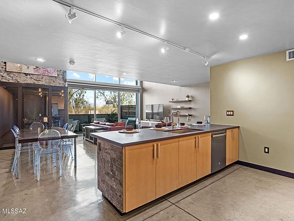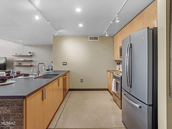 This chic loft is located at the iconic Ice House and featuring 1 1/2 baths, delivering contemporary living at its finest in a prime central location. The open floor plan offers a bright and inviting living area that effortlessly integrates with the dining space and modern kitchen. The wall of windows is equipped with automated blinds to enjoy the natural light or add privacy. The kitchen is equipped with sleek appliances, plenty of cabinet storage with slide outs, Dekton counters, touch faucet, and a long breakfast bar. The loft includes an en-suite bathroom with modern fixtures and a spacious closet. The stylish tile flooring enhances the modern aesthetic. Step outside to a private patio perfect for relaxation or entertaining and take advantage of community amenities such as a swimming pool, fitness center, and covered parking. The unit also comes with its own storage unit on site. Located near the University of Arizona, downtown Tucson, shopping, dining, and entertainment, this condo provides the perfect blend of comfort and convenience. Don't miss this opportunity for vibrant urban living!