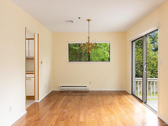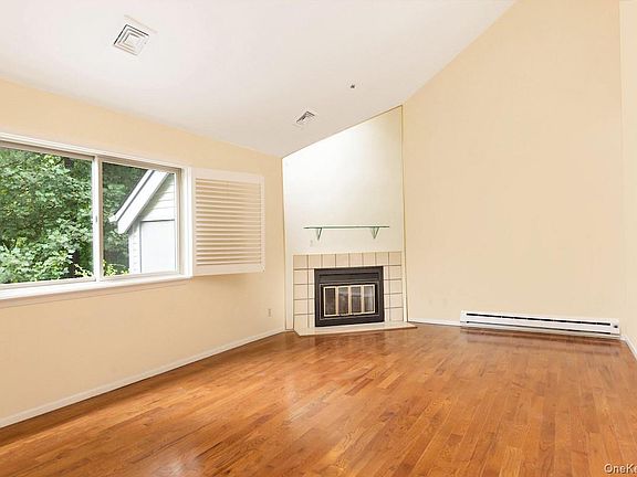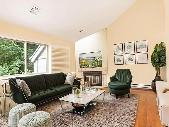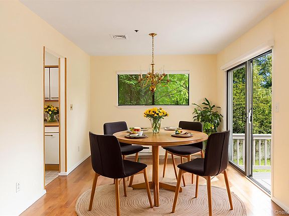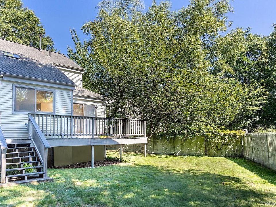 Prized for its unique location, this corner townhome is placed undeniably among the very best settings within Dobbs Ferry's sought-after 20-acre community, Hunters Run! 1001 Hunters Run stands out for its uncommonly spacious and private fenced-in backyard and clubhouse proximity. Take the short pathway to the association swimming pool - like having a pool in your backyard without any of the maintenance worries. You enter a soaring, skylit open plan living room/dining area with 18’ vaulted ceilings and finished with hardwood floors. A wood-burning fireplace adds warmth, while the windows reveal a countryclub-like view of the pool and the lush woodlands of Chauncey Park. Glass sliders in the dining area open to a generous south-facing full-width deck looking out toward the trees. From there, step down to the private backyard, bordered by shrubbery and picket fence. An eat-in kitchen with generous counterspace invites plenty of eastern sunlight streaming in. Upstairs, a hall landing is bright and airy, overlooking the living room. A primary suite includes a spacious bedroom, two large closets, and ensuite bath with separate lavatory area. A second bedroom and hall bath complete the level. Bonus: an sprawling estimated 600 SF finished lower level is perfect for recreation, exercise or home office. The 9.5’ high attached garage offers plenty of storage, even though the walkable location of Hunters Run makes a car less essential. Wander to Rivertowns Square for dinner and a movie, shop in the organic market, hike through Chauncey Park, or bike the South County Trailway just beyond. With a 40-minute train ride to GCT from downtown Dobbs and award-winning Ardsley schools, this home can be your happy haven in the Rivertowns. An annual $1500 STAR tax reduction is available for homeowners who qualify.