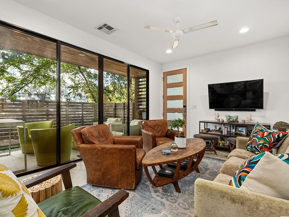 Welcome to this stunning, stand-alone South Austin home in the heart of 78704! This lock-and-leave contemporary retreat is nestled on a quiet dead-end street and boasts an open-concept floor plan, soaring ceilings, and ample natural light. The living and dining spaces flow seamlessly into the open and bright kitchen area. The floor-to-ceiling sliding glass doors on either side of the living space allow for indoor/outdoor living at its best. A large, covered patio and low-maintenance yard space allow for both lively entertaining and low-key living. Upstairs you will find the secondary bedroom, primary suite, and bathroom with a double vanity and sizeable walk-in shower and tub. The primary includes a walk-in closet, large windows showcasing the treetops, and sliding glass doors that lead to a spacious private covered balcony. Located in one of Austin's most desirable neighborhoods, this home offers convenient access to the city’s best, including your favorite dining establishments, shopping areas, entertainment destinations, and nearby outdoor green spaces. Enjoy walking to the South Austin Tennis Center, Rec Center, and South Austin Park. With the perfect balance of urban living and a peaceful retreat, this home is one you don’t want to miss!