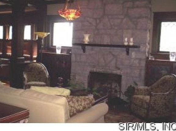 Has a beautiful rough cut and granite/stone fireplace with original leaded glass windows on each side. Built in bookcases with original leaded glass. Original full length beams that line the ceilings in living and dining rooms.