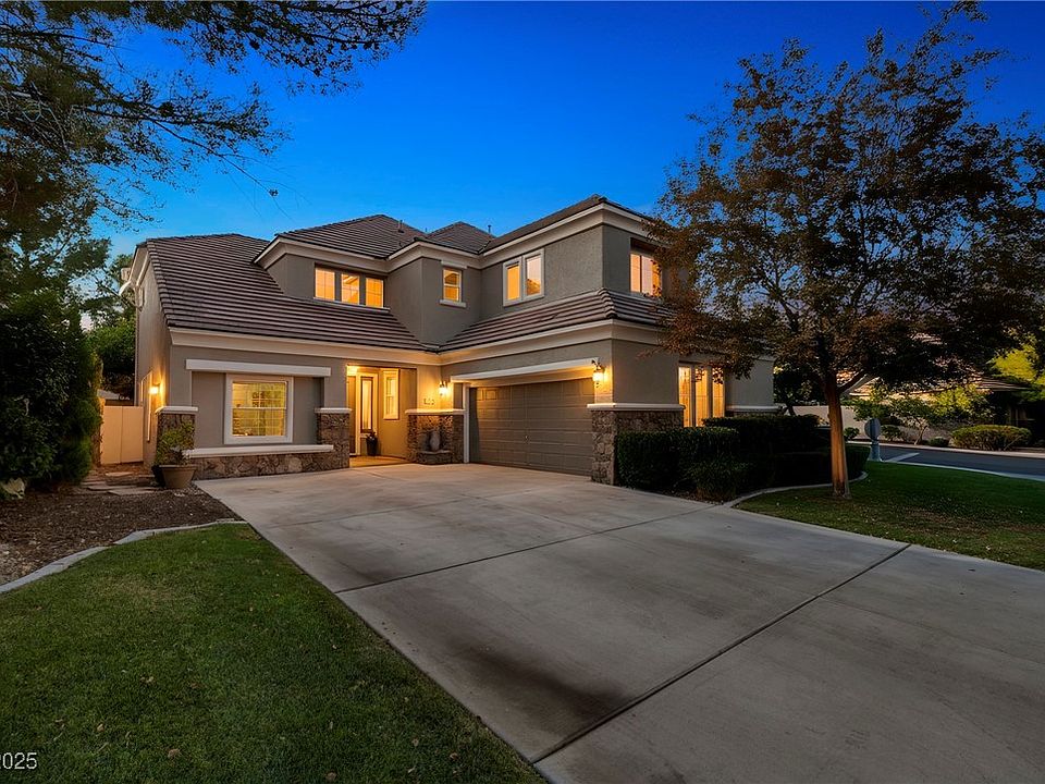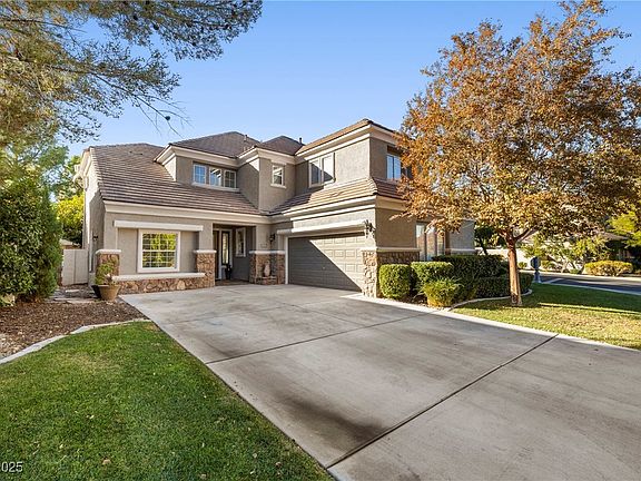 In the sought-after guard-gated community of Queensridge, this 4-bedroom, 3,195 sq ft home offers the scale, light, and versatility that stand out in this price range. Bright interiors include vaulted ceilings, defined living and dining areas, a downstairs den, a separate downstairs bedroom, and an open kitchen and family room overlooking the backyard. Fresh interior paint and new carpet upstairs add to the clean, move-right-in feel. The corner-lot setting provides added curb appeal and a more private yard. Upstairs, a loft creates additional flex space separating the secondary bedrooms from the spacious primary suite. The backyard features a pool, spa, and mature landscaping. Queensridge amenities include guard-gated entry, community pools, tennis courts, fitness center, and close proximity to Summerlin schools, shopping, and dining.