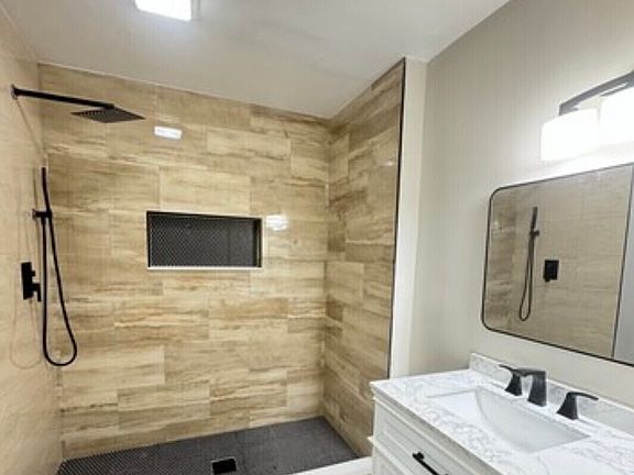 Newly built patio deckStone countertopsCorner lotShaker cabinetsLarge kitchen islandCustom range hoodTiled walk-in shower