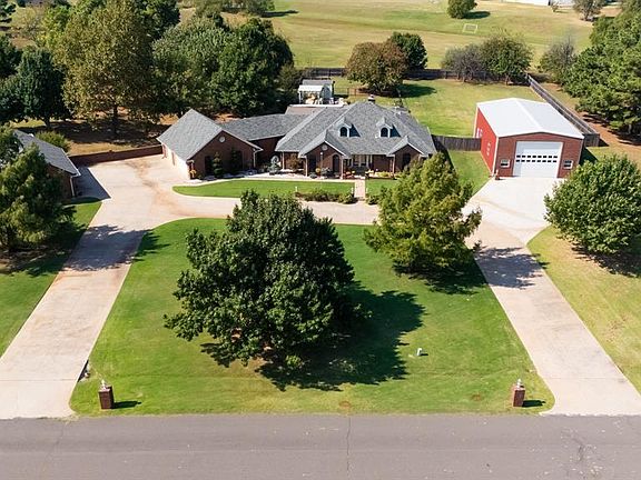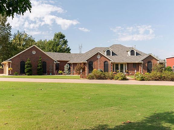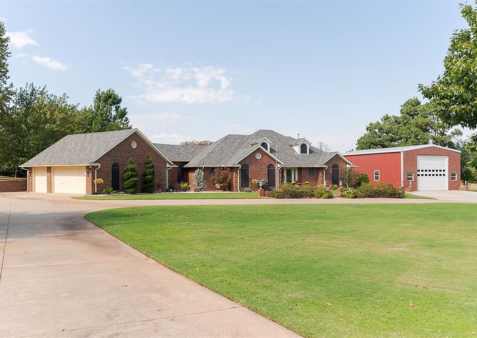 An incredible offering - your countryside retreat in Mustang! This property nestled on 2.3 acres truly encompasses everything on your wish list, including both privacy + a peaceful setting - yet minutes to amenities that allow for optimal convenience. A regal red brick facade, circle driveway & manicured front lawn welcome you- featuring a 4 bedroom/2.5 bathroom main house, private guest home and a new 1500 sq ft workshop- you undoubtedly have it all here - with the unique benefit of providing multi-generational living arrangements. Meticulously maintained and boasting of quality craftsmanship, the stately main home is entered through double doors, with a cozy living room ahead and a spiral staircase to your right, leading to a large bonus room. Built-ins and a gas log fireplace allow the living area to be the focal point of the home, leading to a sprawling kitchen with endless counter space, an island, pantry & dining area. The formal dining space is perfect for hosting loved ones. The master suite boasts gorgeous wood floors, separate vanities, two walk-in closets, soaking tub + shower- and the most fun part? A secret room hidden behind a bookcase! Perfect for a secondary office space or a home gym. A spacious study/office is located off the kitchen & connects to a powder bath. 3 secondary bedrooms & a full bath are found at the north end of the home. A 1500 sq foot weld up workshop constructed in 2022 with full spray foam insulation is ideal for storing your RV, boat, trailers, tractor or side by sides! The backyard is an oasis; swimming pool built in 2020 with covered patio + sun room & pool house w/ bathroom & an abundance of storage space. The 750 sq foot guest home was totally refreshed in 2023. With soaring ceilings, this space lives large- with living area, kitchen, laundry, full bath, bedroom & garage + balcony! Additional highlights include whole home generator, Safe Room & new water heater. It's country living while just minutes to absolutely everything!
