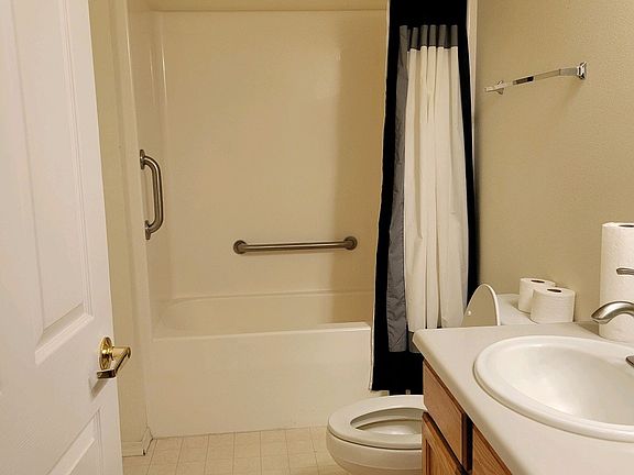 Charming Condo on the first floor, easy access, on the same level as the lobby. There is a parking garage underneath, along with meeting and party rooms. The balcony looks north out into lovely pine trees. The third floor has a library, with puzzles. There are several meeting rooms throughout the complex, and some outdoor party-size balconies. The living room, dining room and kitchen are open to each other making the space airy and friendly. There is a full bathroom just off the entry. The master bedroom is quite large with a huge closet, vanity cabinet and full bathroom attached. The washer/dryer is conveniently tucked into a wall closet. There is a second wall closet with shelves for storage. There is a reserved parking space in the parking garage. Storage units in the garage can be rented. The complex is next door to the Senior Center and behind the county library. It is very close to downtown, too. A lovely place to live.