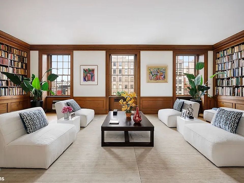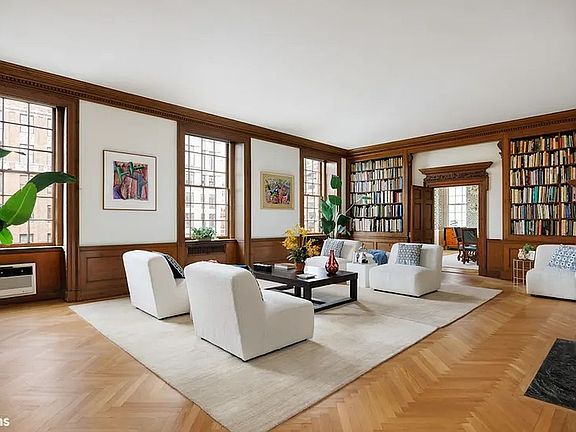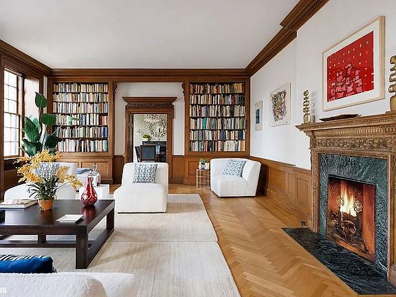 Off a private landing, the large gallery leads to a double sized living room with 10 ½’ ceilings, a wood burning fireplace and views over Park Avenue. The adjacent regal corner formal dining room has another wood burning fireplace and views over Park Avenue. On the opposite side of the living room, a large library could also serve as a den or guest room,
