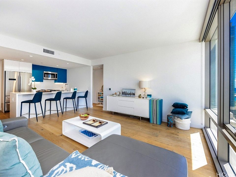 Ultra-modern living meets island style luxury at Ae'o, one of Honolulu's newer condominium developments. Centrally positioned in Ward Village, Architectural Digest's award-winning master planned community, you're just one block from Ala Moana Beach Park and minutes to Ala Moana Center, Whole Foods, nearby shops, restaurants, theaters & more. This beautifully-kept, fully-furnished 1 bedroom residence features modern accents and fine finishes including wood flooring, high-end appliances, designer cabinetry, quartz countertops, plus floor-to-ceiling windows throughout for ample natural light. Partial Pacific Ocean & Ko'olau mountain views captivate from the main living area and bedroom suite. Resort-style amenities await, including a movie theater, kid's play room, formal kitchen and dining spaces, and a unique rooftop sky terrace. Welcome home to island luxury living at Ae'o #1305.