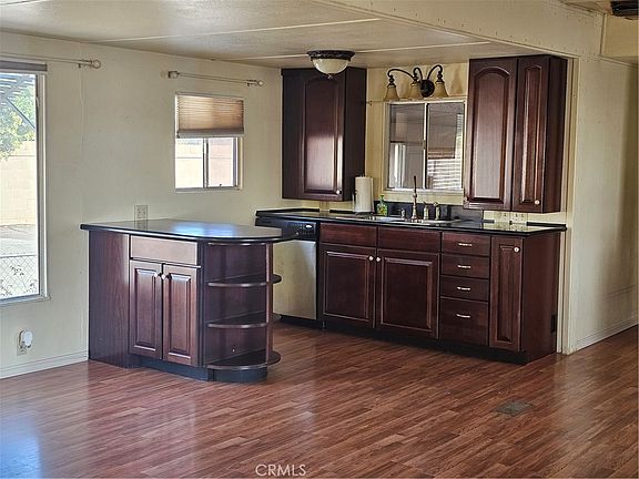 SENIORS WILL L-O-V-E this Super Spacious open floor plan with a newly remodeled kitchen, BEAUTIFUL dark laminate flooring, lots of natural light coming through many windows, plus a porch to enjoy the breathtaking mountain views! Primary and ONLY bedroom is spacious and light, with lots of builtins and closets. Step down a few steps into the Glassed California Room 9X24 approx, with a laundry room, storage, built in ironing board, yet lots of additional space for crafts or projects! Fenced yard, pavers,rock, shrubs, lava rock is easy to care for, chain link fencing and room for gardening if so desired. The 9X20 EXPANDED Great Rroom area adds to the spaciousness. Come see this open floor plan home, easy to maintain smaller home, on a corner lot with a front of home entry. Newer toilet and sink, linen closet in bathroom, with mirrored wardrobe doors gives the bedroom a larger feel in size. (Ser#ckxs351) Space rent to new owner $ 414.84/mo. (to be verified with park upon submission of park application).