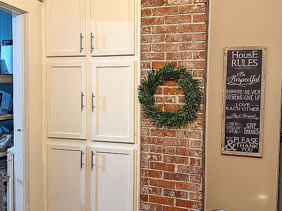 Exposed brick chimneyLots of windowsBeautiful breakfast nook